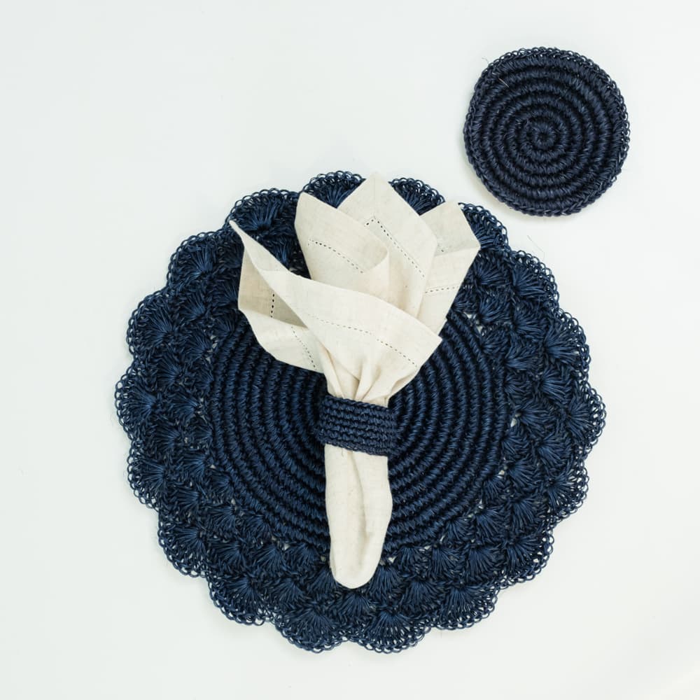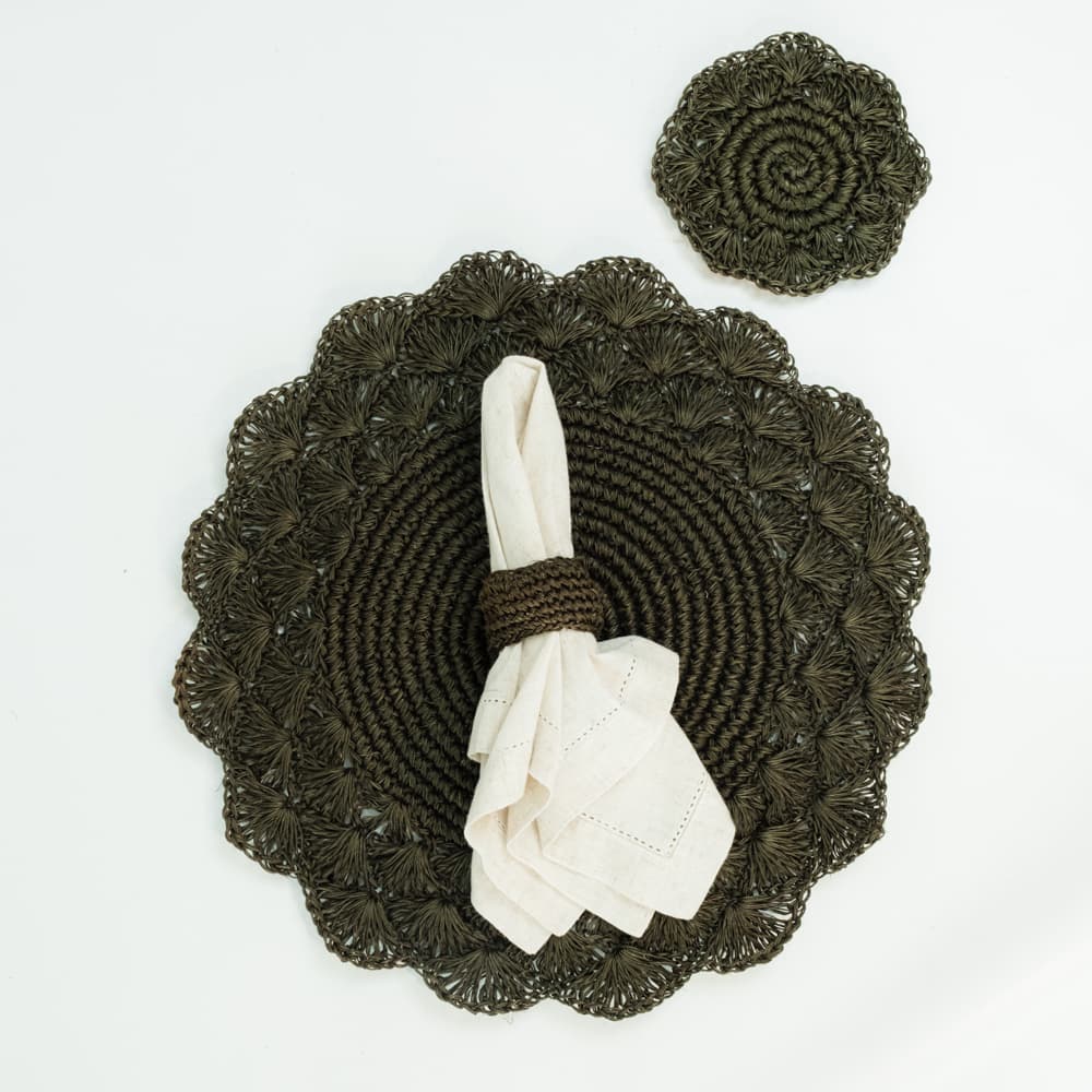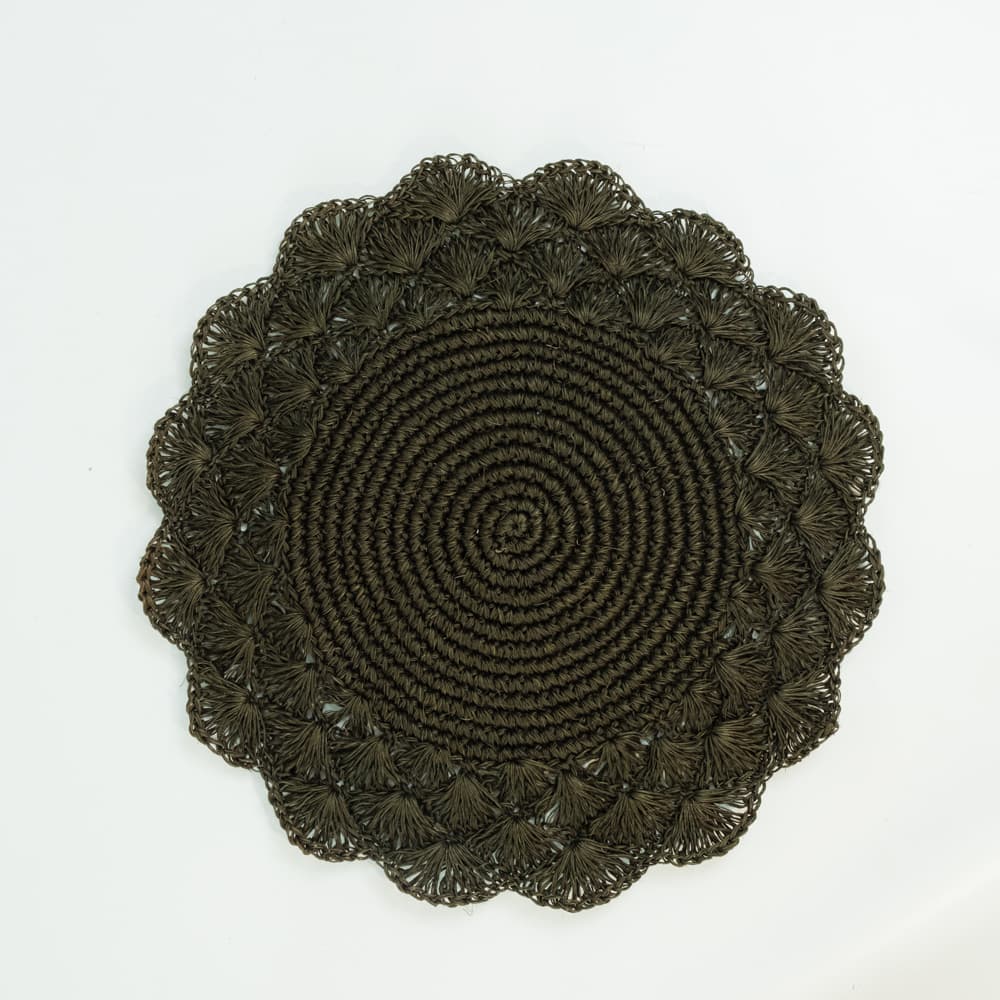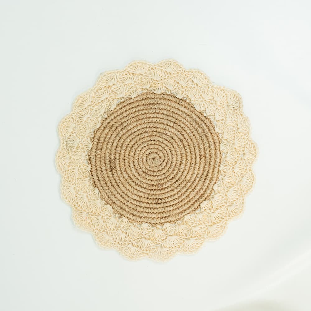 Individual o plato base. Tejido tipo abanico. Diámetro aproximado 38cm. Producto artesanal hecho a mano, puede variar uno del otro.